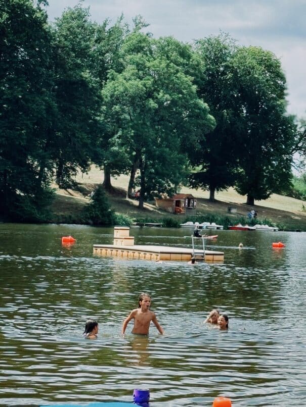 Après-midi : baignade et jeux au plan d’eau, plage surveillée en saison.
